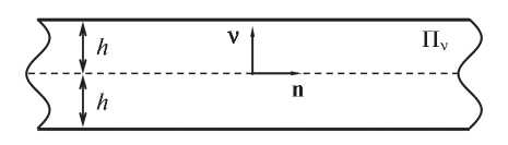 Рис. 1. Слой толщиной 2h; единичный вектор n направлен вдоль распространения волны; v – нормаль к срединной плоскости