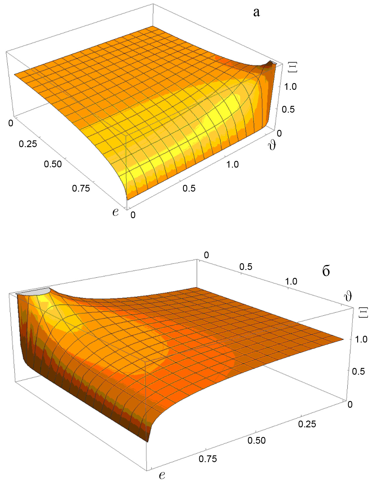 Рис. 1. График зависимости безразмерной поверхностной плотности собственного электрического заряда на сфероидальной капле несжимаемой электропроводной жидкости от величины ее эксцентриситета e и ее полярного угла : а сплюснутая капля; б вытянутая капля.