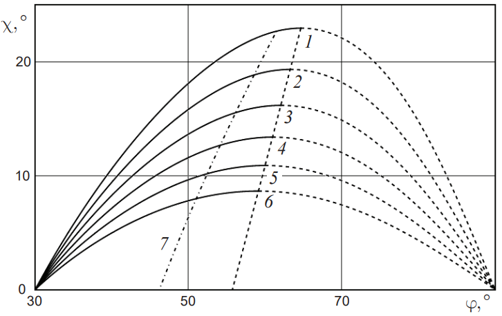 Зависимость угла поворота потока χ от угла наклона ударной волны φ, построенная по формуле (3.4) при числе , приведена на рис. 5, где ветви кривых, изображенные сплошными линиями, отвечают ударным волнам слабого семейства, а изображенные пунктиром – ударным волнам сильного семейства. Прямая пунктирная линия соединяет точки максимального угла поворота потока в ударной волне. Из рисунка видно, что при увеличении значения параметра максимально возможный угол поворота потока уменьшается. В совершенном газе это значение примерно равно . К примеру, в газе АН при максимальное значение составляет всего . При интенсивность ударной волны (скачок скорости в ней) стремится к нулю, а угол j стремится к углу Маха. На рис. 5 штрихпунктирная линия разделяет области сверхзвукового течения (слева) от области дозвукового течения (справа). Заметим, что дозвуковая область увеличивается при увеличении .