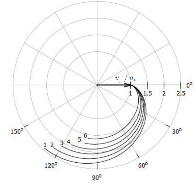 Рис. 4. Диаграмма скоростей для косого скачка уплотнения газа АН: 1) – ; 2) – ; 3) – ; 4) – ; 5) – ; 6) –