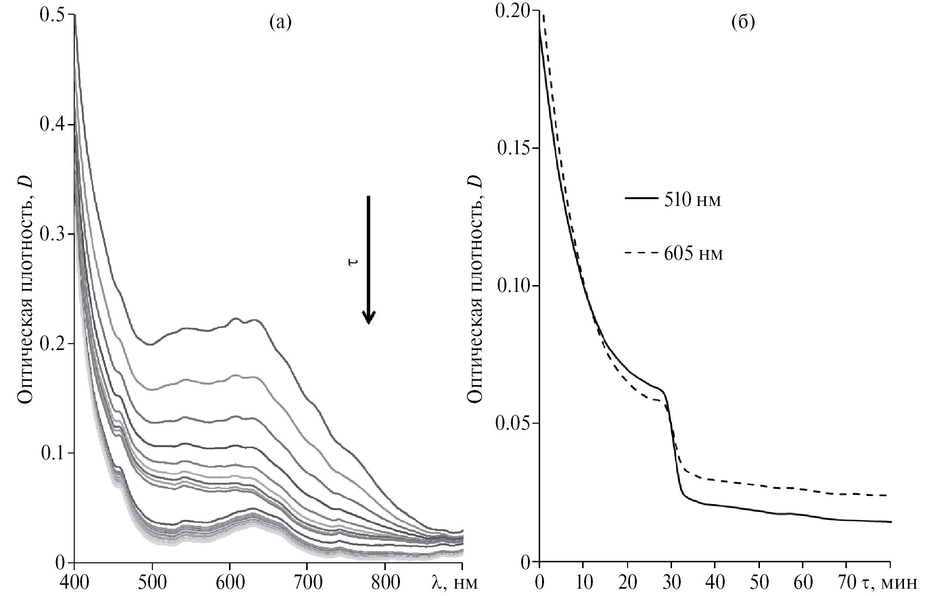 Спектры поглощения растворов регистрировали на спектрофотометре марки UV-1800 производства фирмы Shimadzu (Япония) в интервале длин волн 400–1000 нм с интервалом между сканированиями от 3.5 до 60 мин (раствор сравнения — тридистиллированная вода).