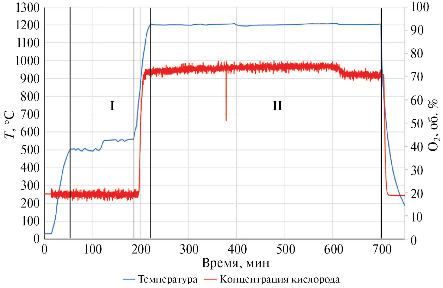 После первой стадии обработки производили подачу O2 для создания атмосферы кислорода в реакторе, при этом концентрация кислорода на конце вакуумной линии составляла 70–75 об%. Реактор нагревали до температуры 1200 ± 10°С со скоростью около 20°С/мин. Продолжительность выдержки ОЯТ в данных условиях составляла 1, 4 и 8 ч соответственно.