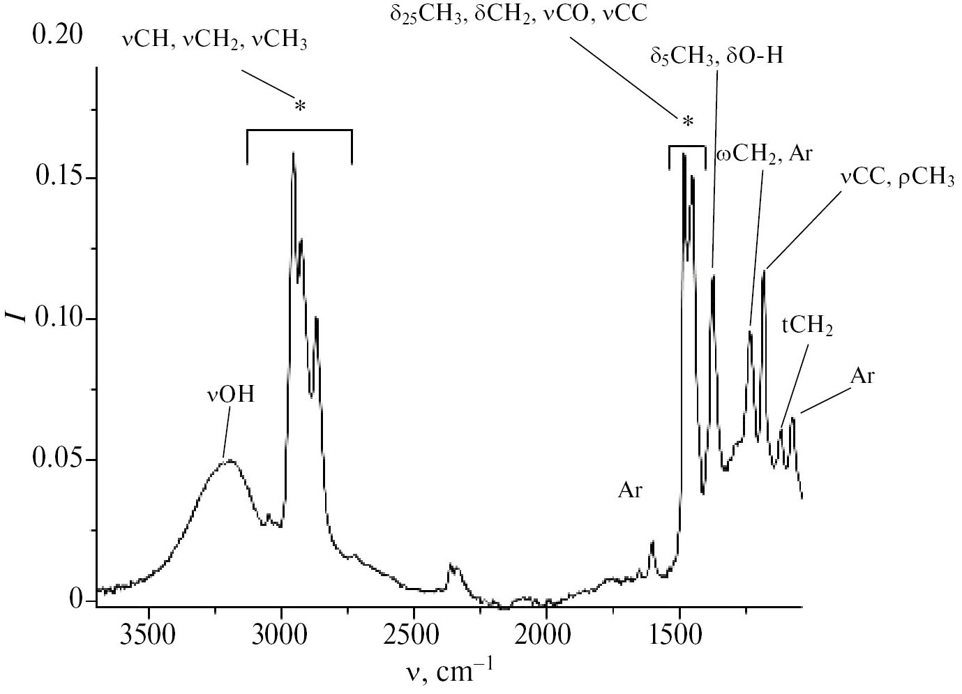 Рис. 3. ИК спектр ИН6 (ν – валентные, δ – деформационные, ω – веерные, t – крутильные, ρ – маятниковые, Ar – колебания ароматической системы).
