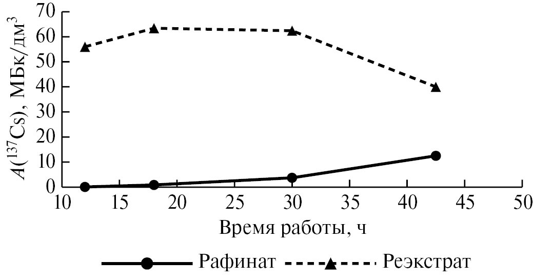 По мере насыщения экстрагента коэффициенты распределения 137Cs в блоке экстракции ожидаемо снижаются. Теоретически при данных коэффициентах распределения извлечение 137Cs на восьми ступенях экстракции должно быть не менее 99.9%. На фоне стабильного микроэмульсионного уноса цезия с блока реэкстракции в блок экстракции и последующего разрушения микроэмульсии в первой ступени блока экстракции можно сделать предположение, что микроэмульсия является источником проскока 137Cs в рафинат блока экстракции. Учитывая стабильный проскок 0.14 МБк/дм3 137Cs в рафинат и объемную активность 0.71 МБк/дм3 оборотной экстракционной смеси, коэффициент распределения 137Cs составит 4.1, что совпадает с данными (4.2) для первой ступени блока экстракции, из которой выходит рафинат.
