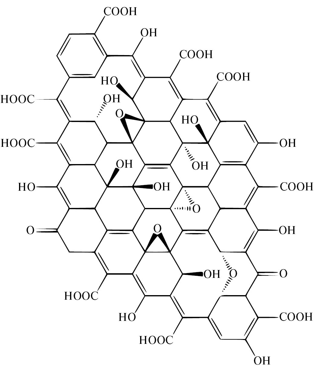 Метод термической активации является простым и удобным способом генерации атомов трития [20]. С его помощью можно заместить водород на тритий в органических молекулах, а также провести модификацию вещества восстановлением функциональных групп и гидрированием кратных связей, что приведет к прочному связыванию трития в составе молекулы. Хотя ОГ представляет собой соединение переменного состава, и количество функциональных групп зависит от метода синтеза [21, 22], для интерпретации результатов работы рассматривали гипотетический структурный элемент (брутто-формула C77H42O37, молекулярная масса 1558 г/моль), представленный на рис. 1, который соответствует свойствам использованного нами препарата [16].