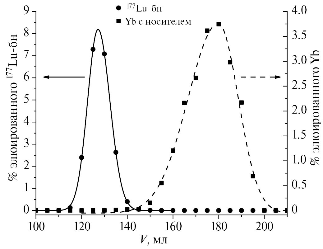 Рис. 1. Кривая элюирования 177Lu-бн без носителя и Yb раствором α-HIBA на колонке Dowex 50WX8.
