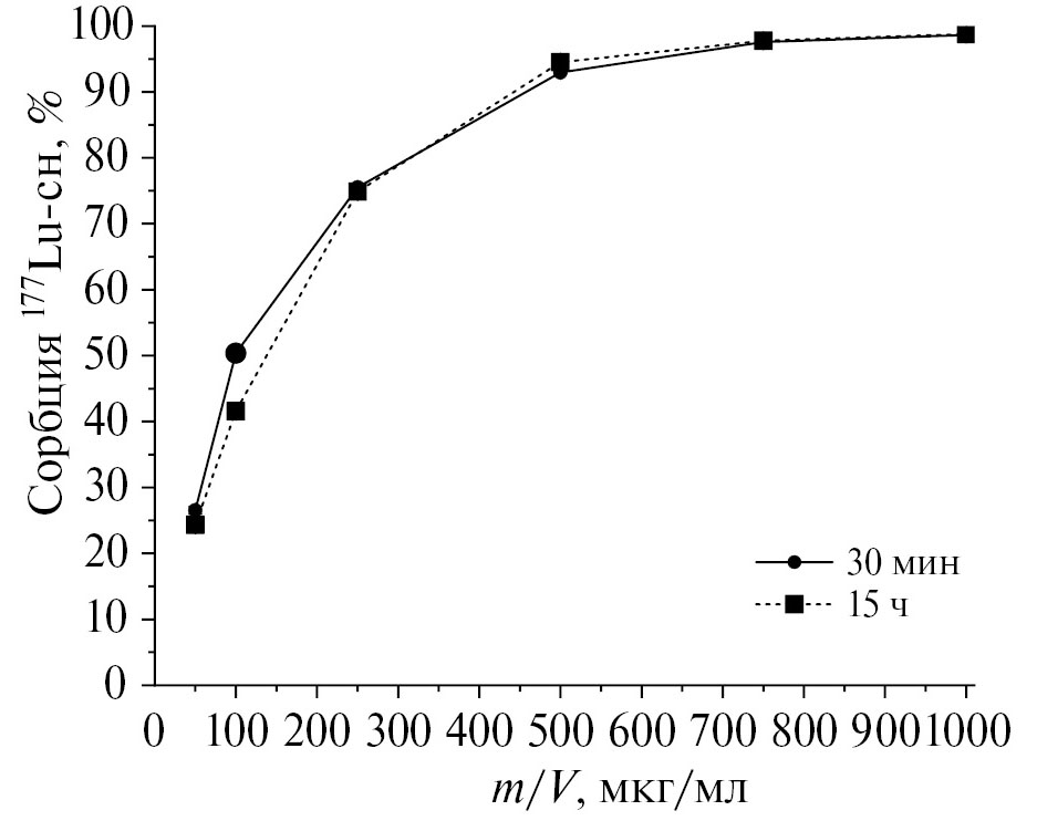 В экспериментах по исследованию сорбции 177Lu-бн масса последнего в каждом образце не превышала 5 × 10–11 г (2.5 × 10–9 М), а при изучении сорбции 177Lu-сн масса составляла 20 или 300 нг на образец (1.1 × 10–7 и 1.7 × 10–6 М соответственно), что по массе соответствует 177Lu-бн с активностью 80 МБк и 1.2 ГБк (здесь и далее приведены расчеты для 177Lu-бн c максимальной удельной активностью 4.2 ТБк/мг).