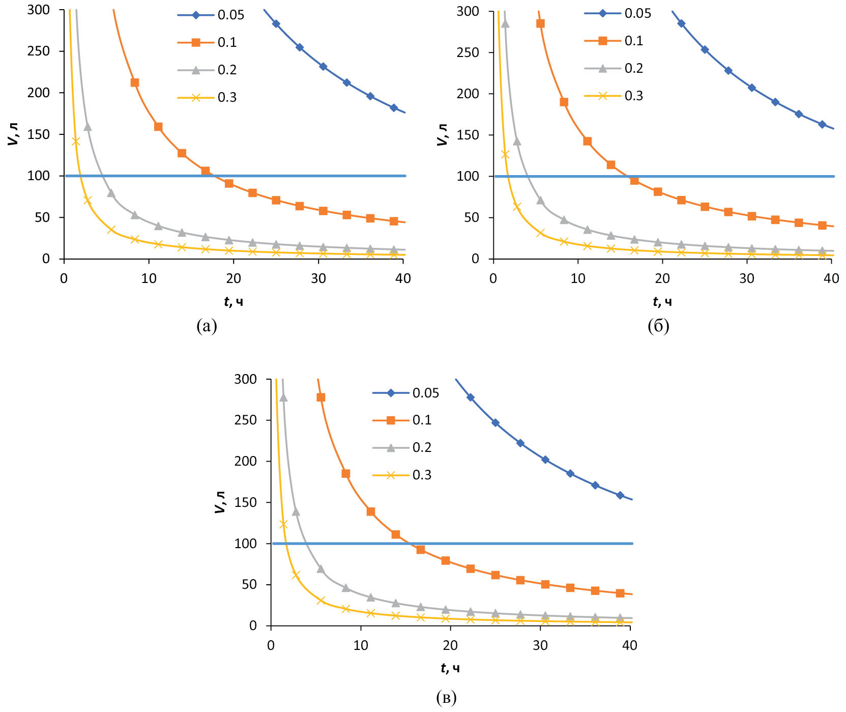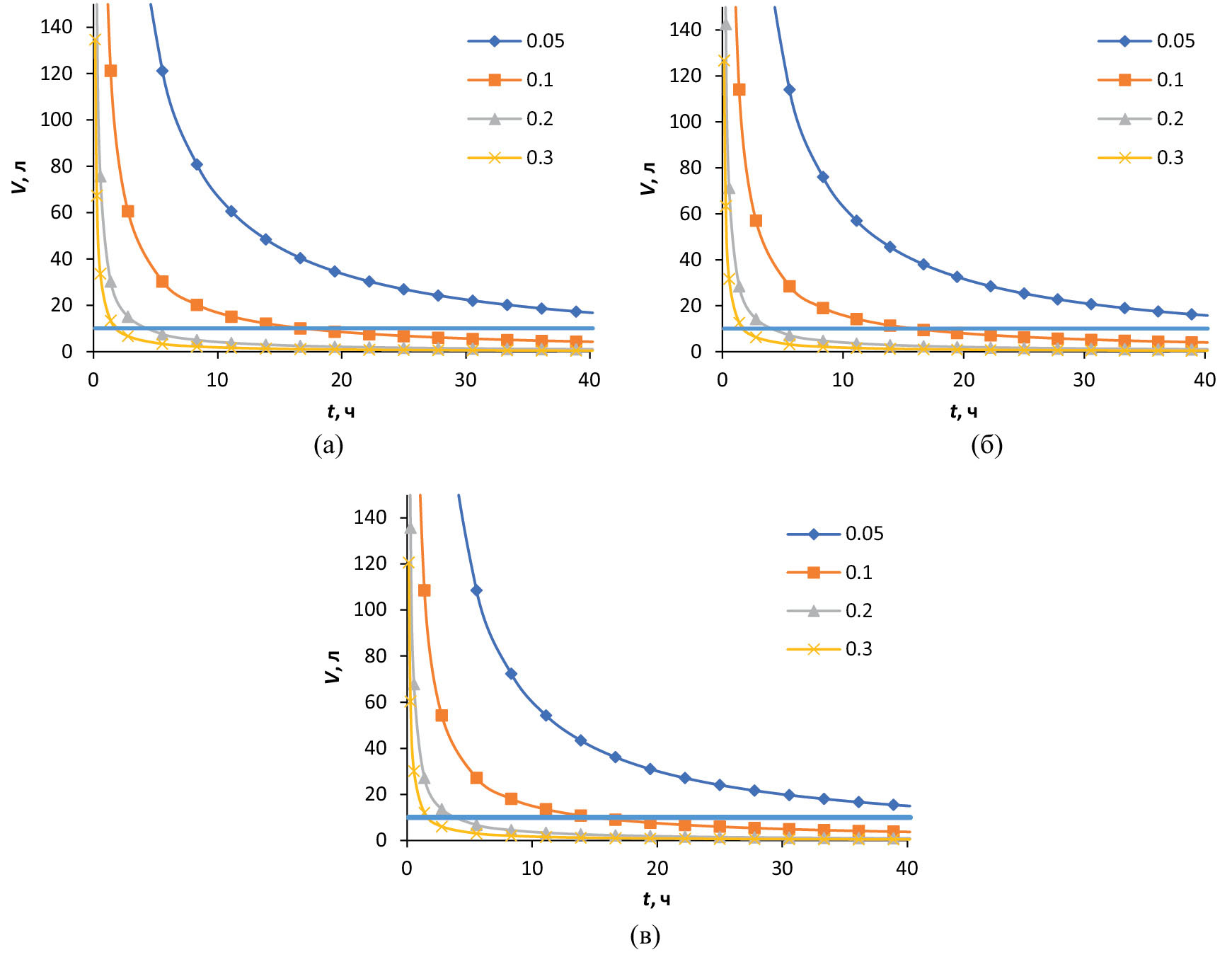 Рис. 3. Соотношение объемов пробы, времени измерения концентрата и относительной погрешности результата измерения концентрата при определении удельной активности 137Cs с МОА = 0.01 Бк/л: а – сорбент Т-35, mс = 3 г; б – сорбент НКФ-Ц, mс = 0.5 г; в – сорбент НКФ-ГДТ, mс = 2 г.
