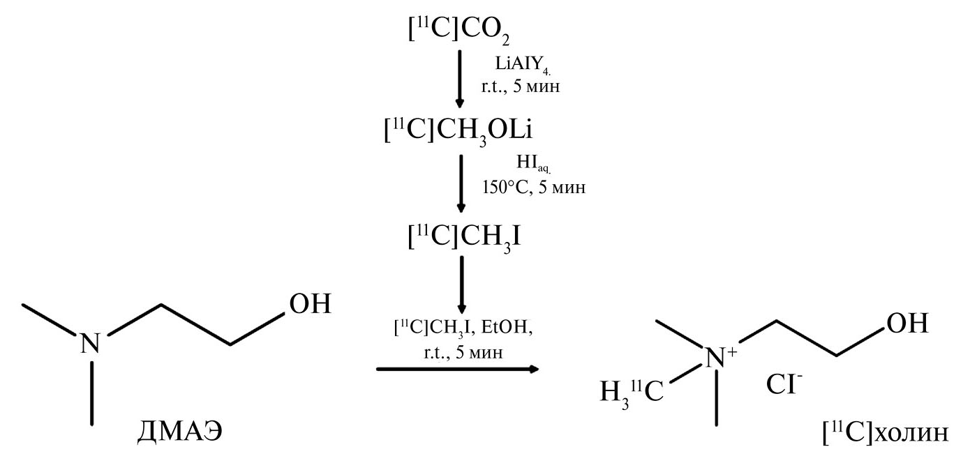 Метод синтеза [N-метил-11С]холина включает две основные стадии: получение алкилирующего агента [11С]CH3I и непосредственно реакция N-метилирования ДМАЭ, выполняющего роль растворителя и основания [7] (Схема 1). Для получения [11С]CH3I используют классический «мокрый» метод, основанный на реакции восстановления [11С]CО2 алюмогидридом лития (LiAlH4) с последующей конверсией в [11С]CH3ОLi и далее в [11С]CH3I реакцией с 57% HI; автоматизация «мокрого» метода, применяемого и в данной работе, подробно описана ранее [4]. Альтернативой является газофазный метод, где [11С]CH3I получают путем свободнорадикального иодирования [11С]CH4 парами иода при повышенных температурах [2].