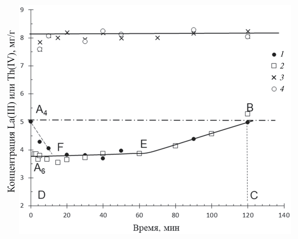 Результаты, приведенные на рис. 2–4, позволили составить представление о характере процессов, протекающих в динамических условиях при сорбции фторидов неодима и лантана из расплавов. Далее приводили опыты по сорбции фторида лантана в присутствии фторида тория в динамических условиях. Ранее было показано, что фторид тория практически не сорбируется активным углем АГ-3 из эвтектики LiF–NaF–KF при температуре 650°С [6, 7], однако в динамических условиях процесса очистка фторида лантана от фторида тория может быть реализована с большой долей вероятности.