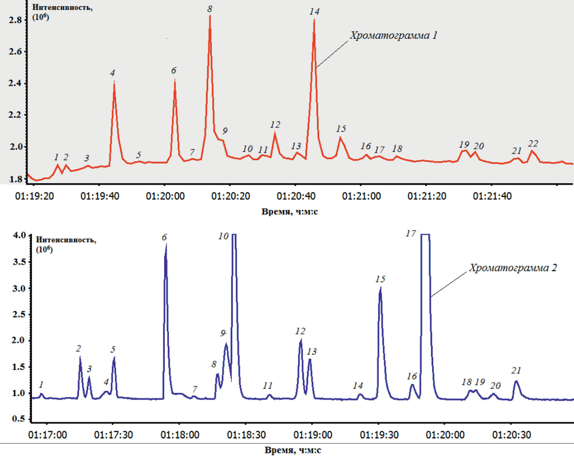 Облученный ВП-1АП (Хроматограмма 1) | Необлученный ВП-1АП (Хроматограмма 2) |