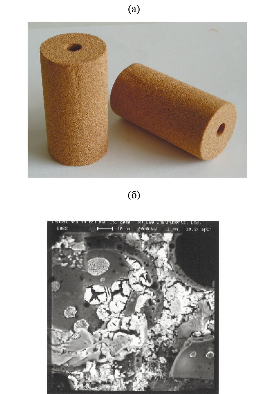 Рис. 1. Внешний вид блоков «Губка» (а) и распределение соли во внутреннем поровом пространстве “Губки” (б).