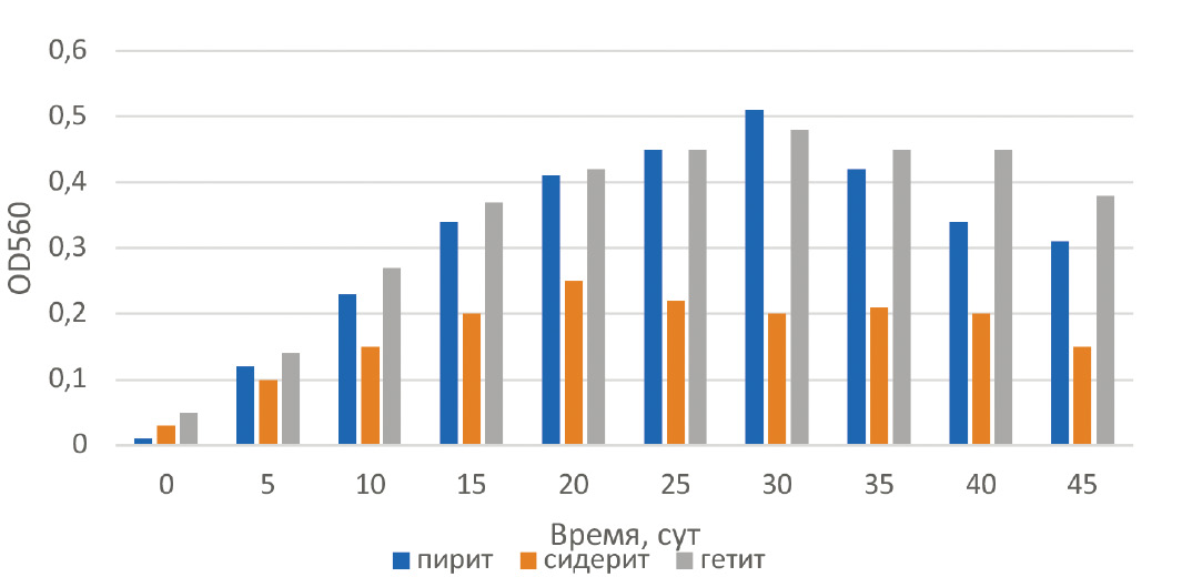 Для оценки интенсивности микробного преобразования проводили анализ микробной активности на поверхности образцов (рис. 3). Максимальная интенсивность микробного дыхания отмечалась к 30-м суткам для пирита, поскольку помимо железа в его составе содержится сера, необходимая для развития микроорганизмов. Мы полагаем, что в данном случае в биообрастании участвовали как железо, так и сероокисляющие микроорганизмы.