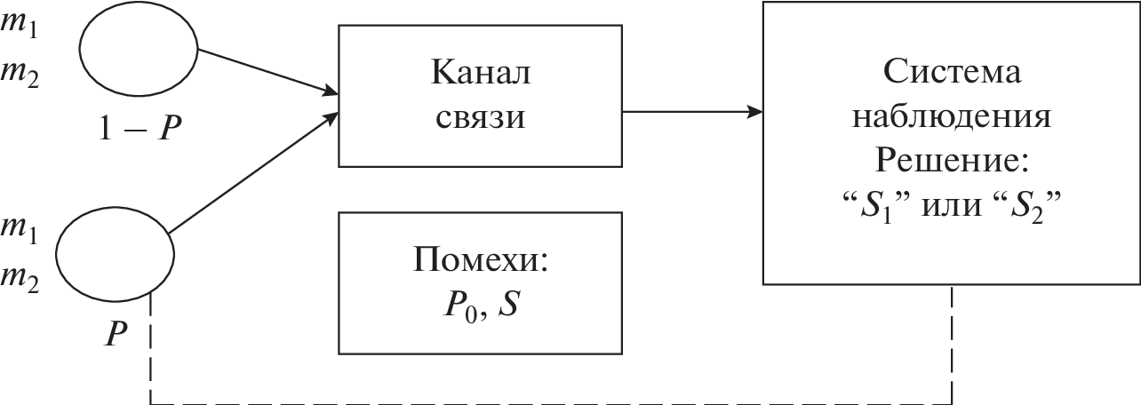 The problem of identification of two sources of binary signals against a background of transforming and erasing types of noise under counteraction conditions is considered. The situation is described by an antagonistic game, the analytical solution of which gives the optimal strategies of the players and the price of the game as a function of the a priori probability of the appearance of one of the sources. Particular cases are considered.
