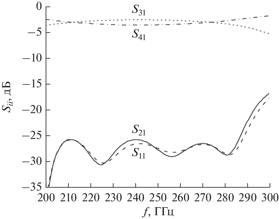 The microwave properties of the components of the waveguide structure of a heterodyne receiver in the 211...275 GHz range with sideband separation based on a pair of superconductor–insulator–superconductor (SIS) tunnel junctions are described. The following elements of the waveguide were studied structures: hybrid four-port splitter, directional coupler, T-shaped splitter body and waveguide absorber. S parameters were calculated for all elements. For hybrid divider additionally shows a phase balance with deviations of less than 0.4 degrees, and an amplitude balance within 1 dB. The expected level of quality of band separation in a band separation receiver using the studied waveguide elements is analyzed; its value is more than –25 dB. The waveguide elements are designed taking into account the fact that the block will be manufactured using precision milling; the minimum dimensions of the waveguide structure are limited by the diameter of the cutter used; in our case, 100 μm was chosen. All numerical calculations were performed using the finite interval method in the HFSS package.