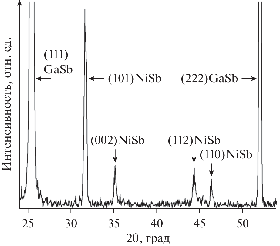 It was shown for the first time that when nickel is deposited onto a heated gallium antimonide substrate, diffusion of antimony atoms from the substrate into the growing film occurs and a nickel antimonide film is formed, which has an axial texture with an axis perpendicular to the film plane along the (101) direction.