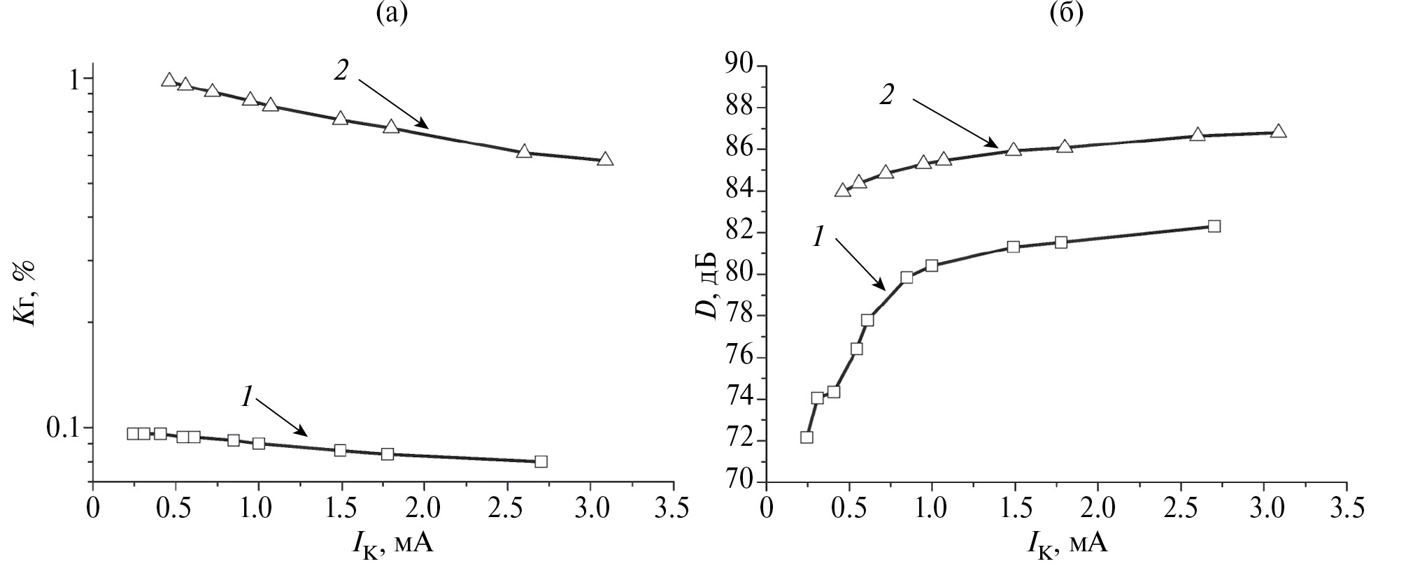 Измерение коэффициента гармоник проводилось при амплитуде 5 мВ напряжения входного гармонического сигнала. Из рис. 7а видно, что с ростом коллекторного тока величина коэффициента гармоник уменьшается, при этом охлаждение усилителя до 77 К почти на порядок повышает коэффициент гармоник по сравнению с его значением при 300 К. Что касается динамического диапазона (рис. 7б), то при увеличении коллекторного тока динамический диапазон усилителя увеличивается, а охлаждение усилителя до 77 К приводит к его расширению на величину порядка 5 дБ.
