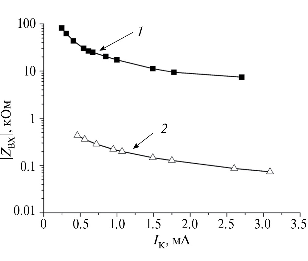Рис. 8. Зависимость модуля комплексного входного сопротивления усилителя от тока коллектора при T = 300 (1) и 77 К (2).