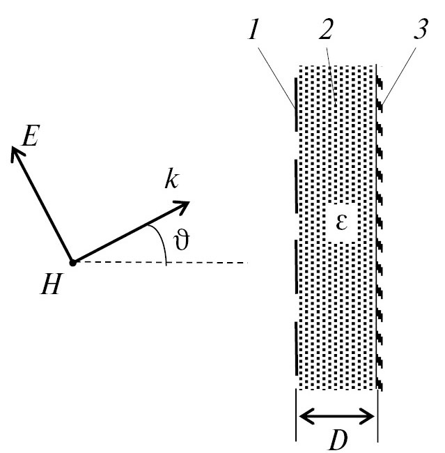 Рис. 1. Схема ИМП: 1 – частотно-селективная решетка, 2 – слой диэлектрика толщиной D, 3 – металлический экран, ϑ– угол падения электромагнитной волны.