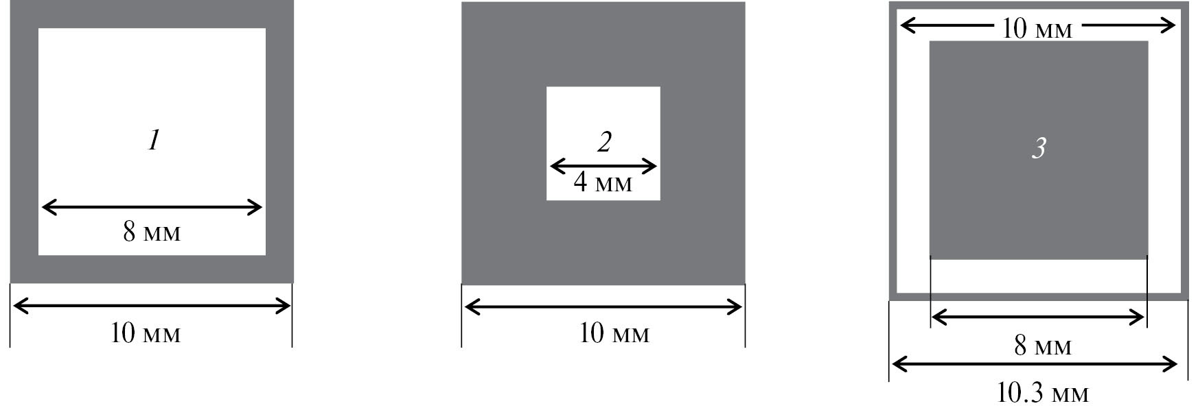 На рис. 2 представлены два типа элементов частотно-селективных решеток: полосно-отражающих 1, 2 и полосно-пропускающих 3. Элементы полосно-отражающих решеток – это квадратные металлические петли, а элементы полосно-пропускающих решеток – квадратные щели в металлическом экране, период решеток P = 10.3 мм. Толщина слоя диэлектрика между решеткой и экраном D = 0.5 мм, а его диэлектрическая проницаемость ε = 10.2. Характеристики решеток, состоящих из элементов 1–3, в условиях свободного пространства (резонансная частота fр и Q-фактор) приведены в табл. 1. В дальнейшем нумерацию ИМП и РП будем использовать ту же, что и для элементов решеток.