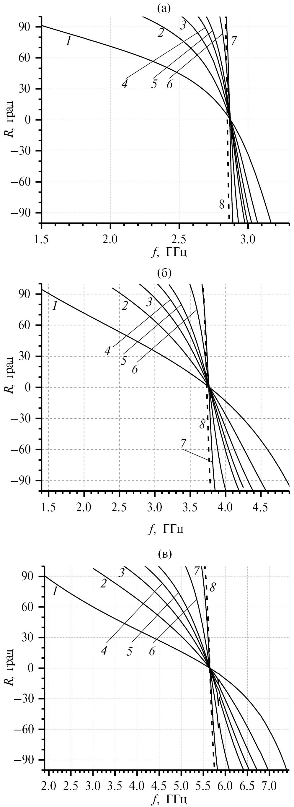 Рис. 3. Частотно-угловые зависимости фазы коэффициента отражения от ИМП на основе решеток с элементами трех типоразмеров 1 (а), 2 (б) и 3 (в). Углы падения ϑ равны 89° (1), 88° (2), 87° (3), 85° (4), 83° (5), 80° (6), 60° (7) и 0° (8).