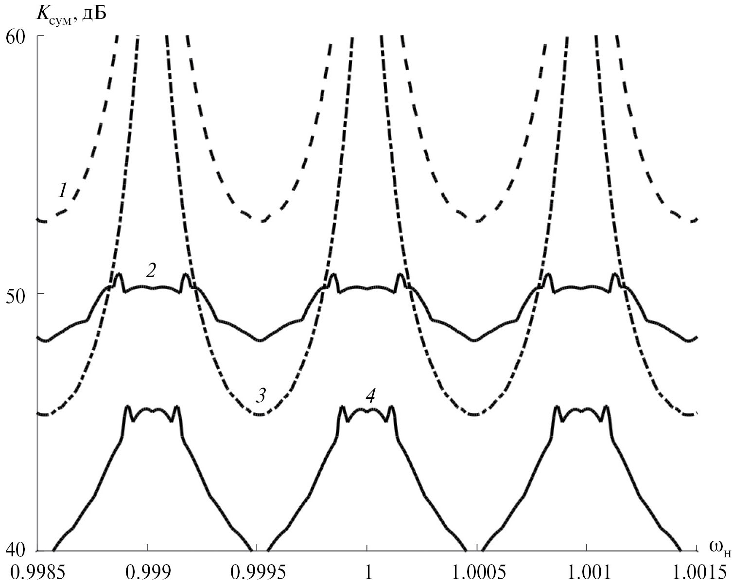 Рис. 4. Зависимости суммарного коэффициента эффективности режекции УП от нормированной частоты при удалении Nуд = 50 частотных выборок; взвешивание реализации ВФ (1), Парзена (2), (3) и (4).