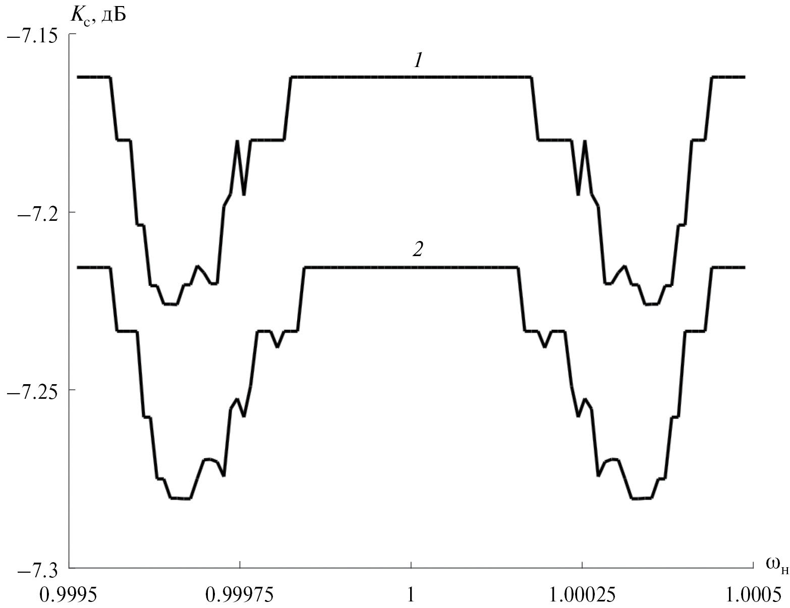 Рис. 6. Зависимости коэффициента прохождения ФМ-СРС от нормированной частоты при удалении Nуд = 50 частотных выборок; взвешивание ВФ ДЧ5(1) и (2).