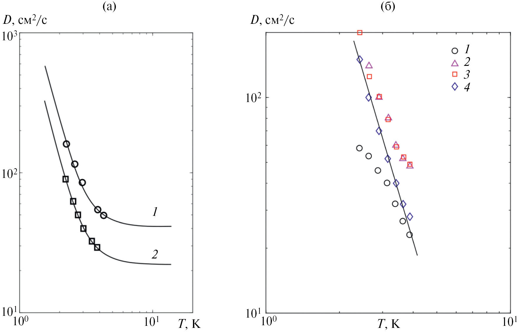 Рис. 3. Экспериментальные (точки) и расчетные (кривые) зависимости коэффициента диффузии D от температуры (а) в образцах YSZ длиной 0.1 см с концентрацией 12 (1) и 20 мол. % Y2O3 (2). Зависимости коэффициента диффузии от температуры в YSZ (б): сплошная линия – D ~ T–4 ; кривая 1 – 5 % Y2O3, L = 0.08 см; кривая 2 – 20 %, L = 0.085; кривая 3 – 20 %, L = 0.04; кривая 4 – 5 %, L = 0.05.