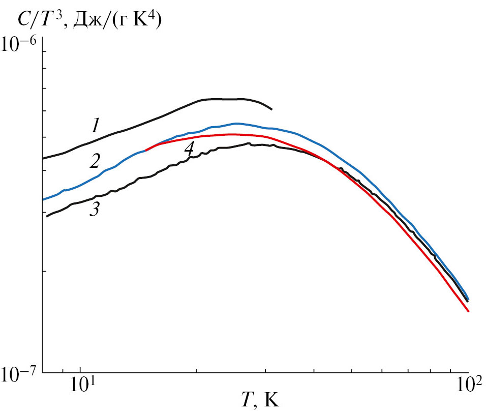 Подобный характер поведения зависимости C(Т)/Т3 наблюдался при переходе от кристаллического состояния в аморфную фазу (стекло) в редкоземельных пентафосфатах [20].