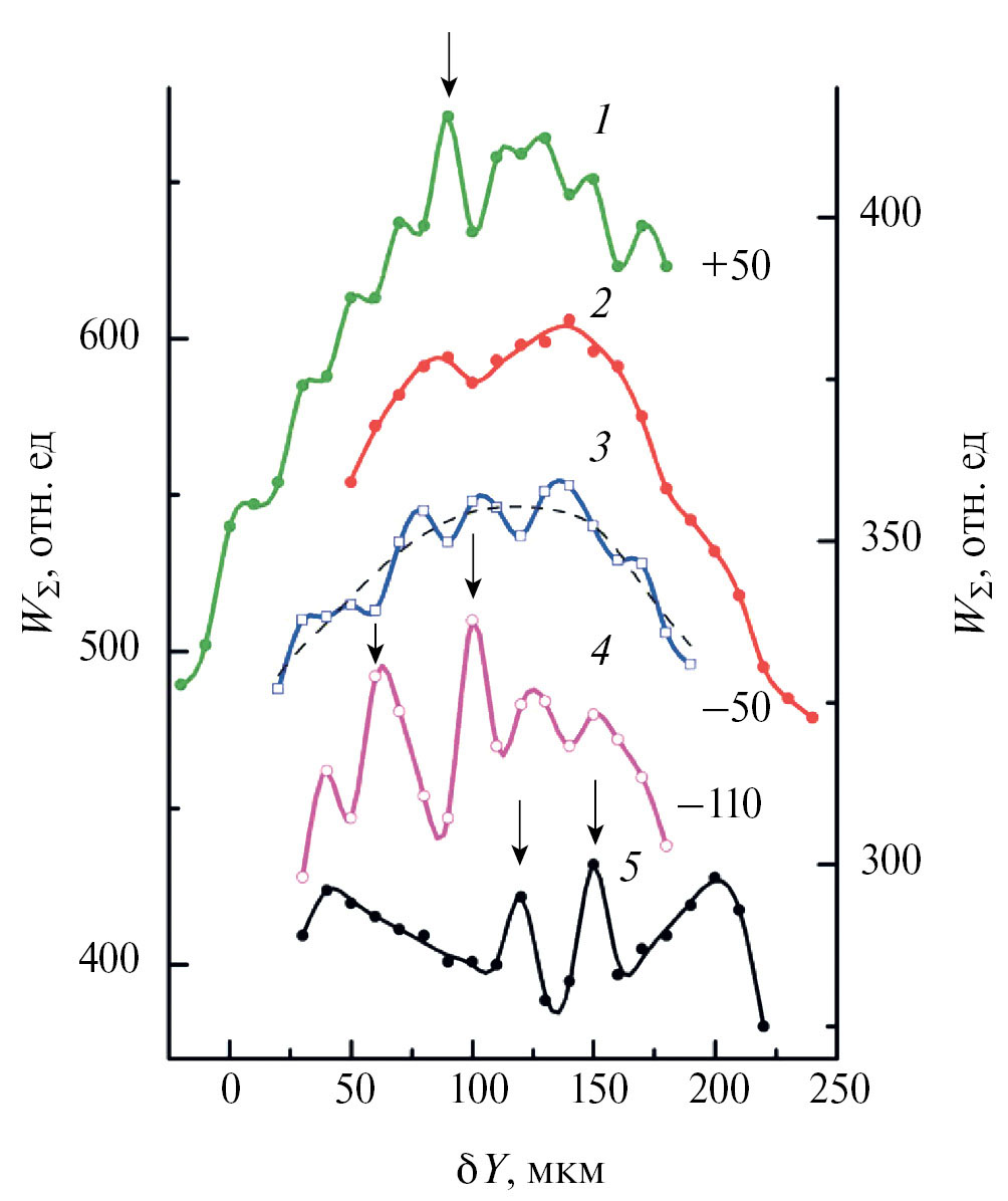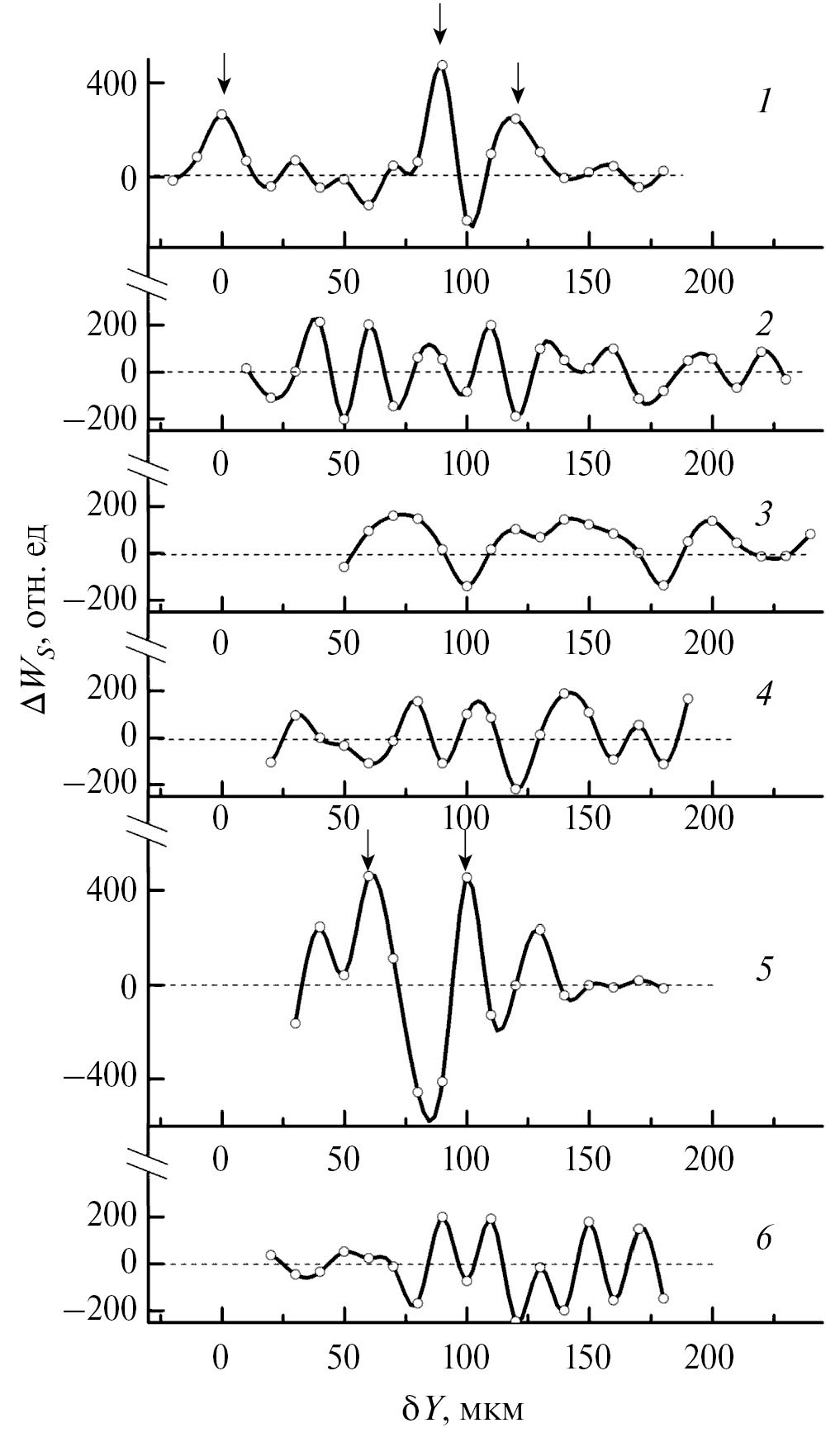 Описанные результаты получены благодаря измерениям излучения, располагавшегося в максимуме диаграммы направленности. Но при Wex = 3.9 отн. ед. было однократно выполнено ещё и измерение энергии излучения на периферии диаграммы его направленности, т.е. распространявшегося в гетероструктуре и преломлявшегося при выходе из нее под другими углами, чем излучение из максимума диаграммы. На графике этой зависимости выделились два высоких и узких ЛВ при δY = 120 и 150 мкм (см. рис. 1, кривая 5). Подобные им высокие ЛВ, выявляющие локально возникающие наиболее сильные колебания в модуляции энергии излучения (на рис. 1 и 2 на такие ЛВ указывают стрелки) наблюдаются при δY = 60 и 100 мкм (см. рис. 1, кривая 4, рис. 2, кривая 5), при δY = 90 мкм (кривая 1), а также при δY = 0 и δY = 90 и 120 мкм (см. рис. 2, кривая 1). Они вызваны тоже РР, см. ниже.
