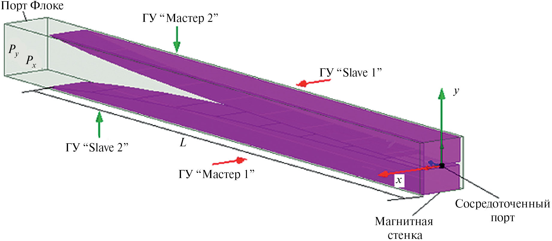 Исследуем кластер ТЕМ-рупоров, конечный по одной оси и бесконечный по другой со следующими параметрами: длина элемента решетки L = 180, а величины периодов решетки в Е- и Н-плоскости равны соответственно Py = 15 и Pх = 15 (см. рис. 2), причем период рассматриваемой решетки меньше половины длины волны. Здесь и далее все размеры приводятся в миллиметрах. Реализован экспоненциальный закон зависимости волнового сопротивления в сечении канала Флоке от координаты 0z. Отметим, что на продольных стенках ячейки установлены специальные граничные условия “Master–Slave” (см. рис. 2), поперечная стенка на границе пустого канала представляет собой порт Флоке, который имеет две моды, соответствующие двум поляризациям. Поперечную стенку вблизи сосредоточенного порта объявляем магнитной, что соответствует холостому ходу в терминах линии передачи, или идеальному частотно независимому резонатору. Такой подход позволяет нам не учитывать частотную зависимость системы возбуждения, которое на практике весьма велико в таких структурах и оказывает заметное влияние на характеристики решетки. Импеданс порта 1 равен Zc1 = 25 Ом, импеданс пустого канала (волновода Флоке) при этом равен 377 Ом. Пусть количество элементов в кластере равно 2N + 1 = 17, при этом обеспечивается равномерное амплитудное распределение.