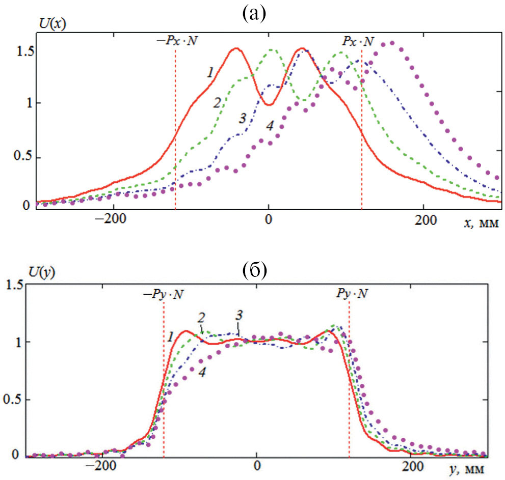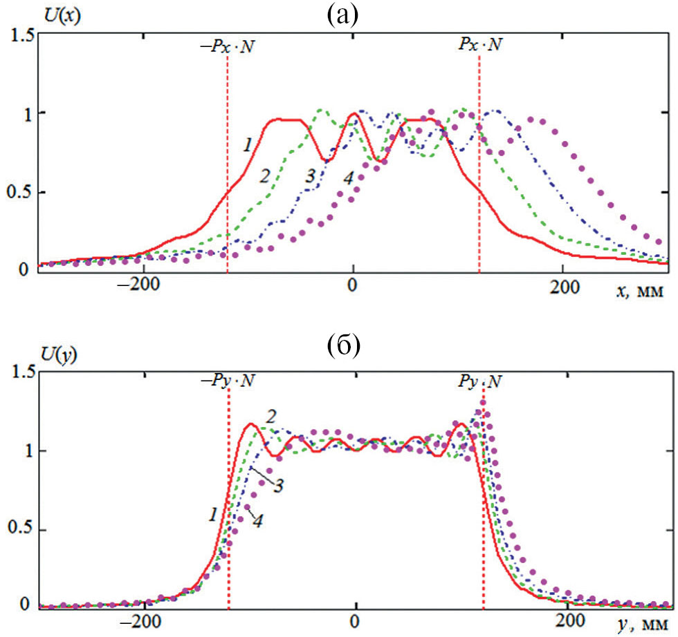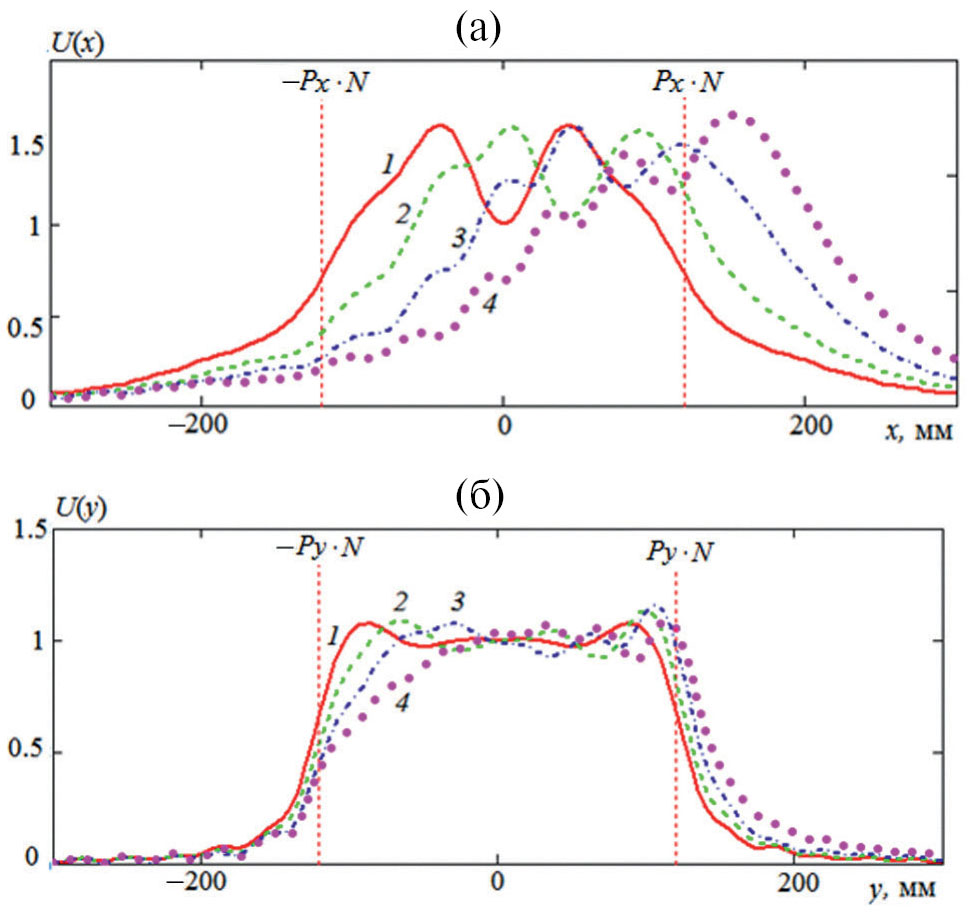 Также необходимо отметить существенно разное поведение поля в плоскостях Е и Н. Искажения формы и смещение в Н-плоскости проявляются значительно сильнее, чем в Е-плоскости. При этом искажения формы в Н-плоскости имеют характер “расплывания”, которое проявляется в том, что поле выходит за границы кластера. Кроме того, наблюдается также эффект “сглаживания”, который выражается в исчезновении резких границ области, занятой полем. Особенно сильно эти эффекты выражены на низких частотах (см. рис. 4а,4б). В Н-плоскости они привели к изменению формы амплитудного распределения от прямоугольной на входе в решетку до колоколообразной на выходе из нее. С повышением частоты указанные эффекты остаются, но выражены уже не столь сильно.