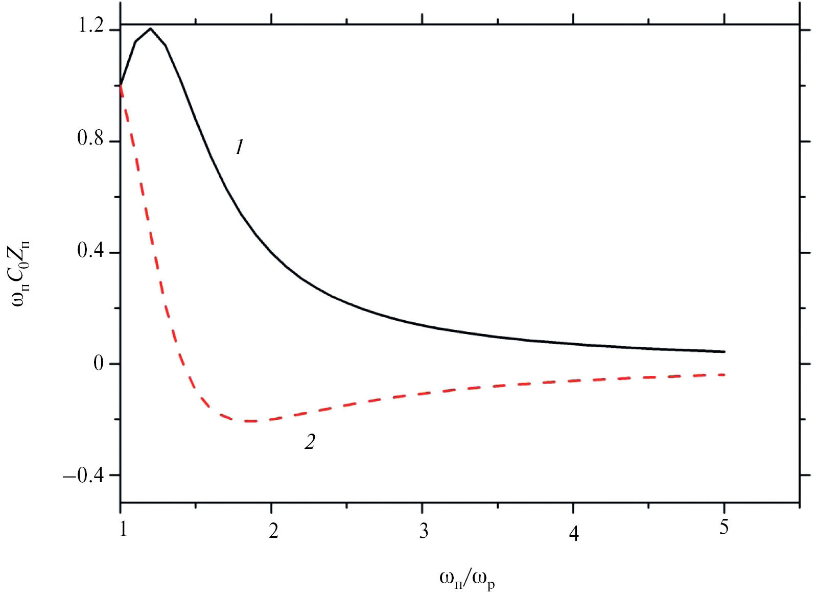 Как видно из рис. 3, величина реактивного сопротивления претерпевает значительные изменения в области ωп ~ (1…2) ωр. Реактивная составляющая Zп на частотах >2.2 ωр мала для всех значений длины плазменного столба. В дальнейшем будем считать сопротивление плазменного столба чисто активным.