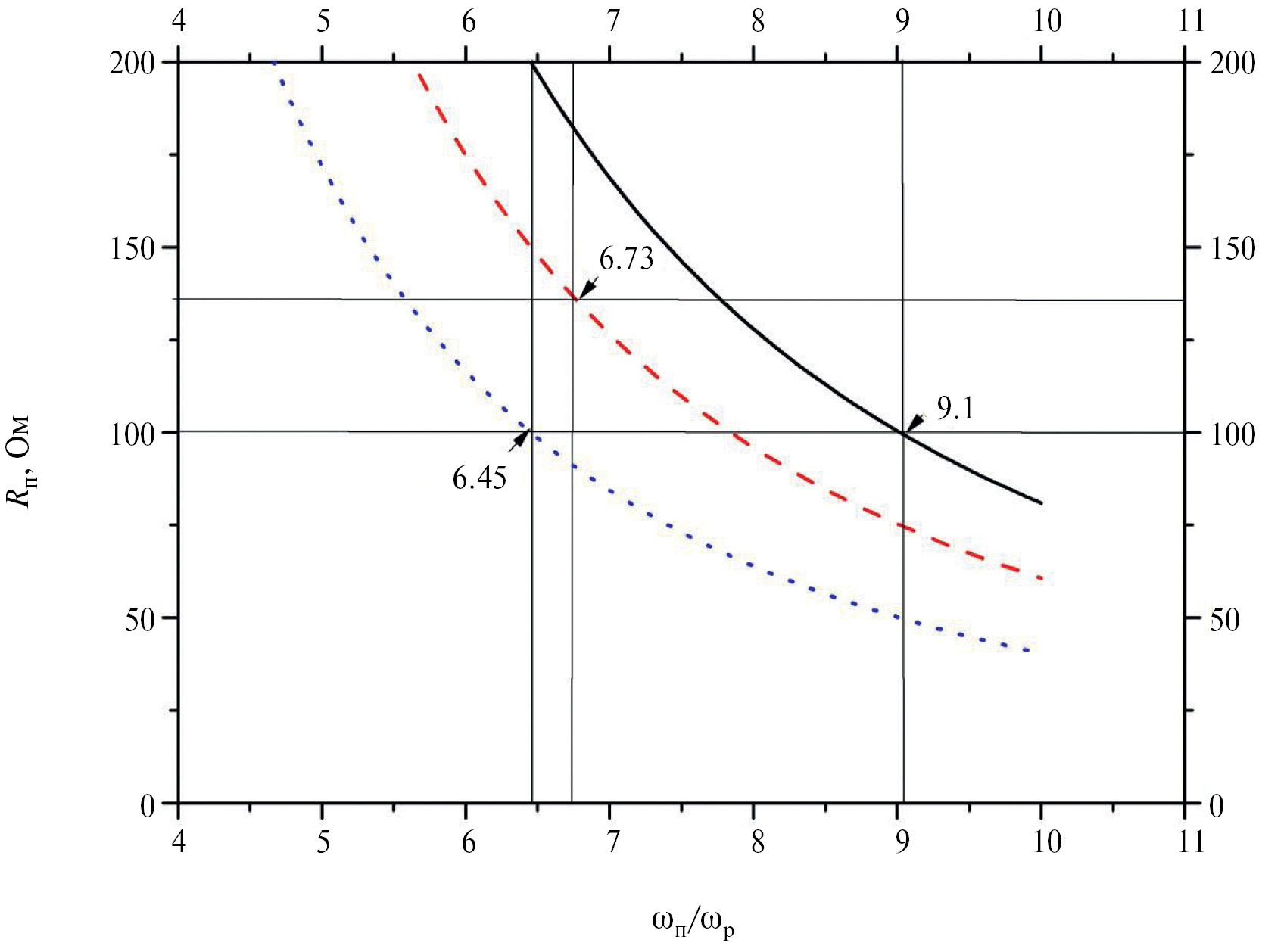 Рис. 4. Зависимости активной составляющей сопротивления плазменного столба от ωп (ωр = 9 × 108 рад/с) для длины плазменного столба lст: 0.5 Lт (пунктир), 0.75 Lт (штриховая кривая), 1.0 Lт (сплошная). Стрелками отмечены точки, соответствующие значениям сопротивления плазменного столба, полученным по измерениям КСВ.