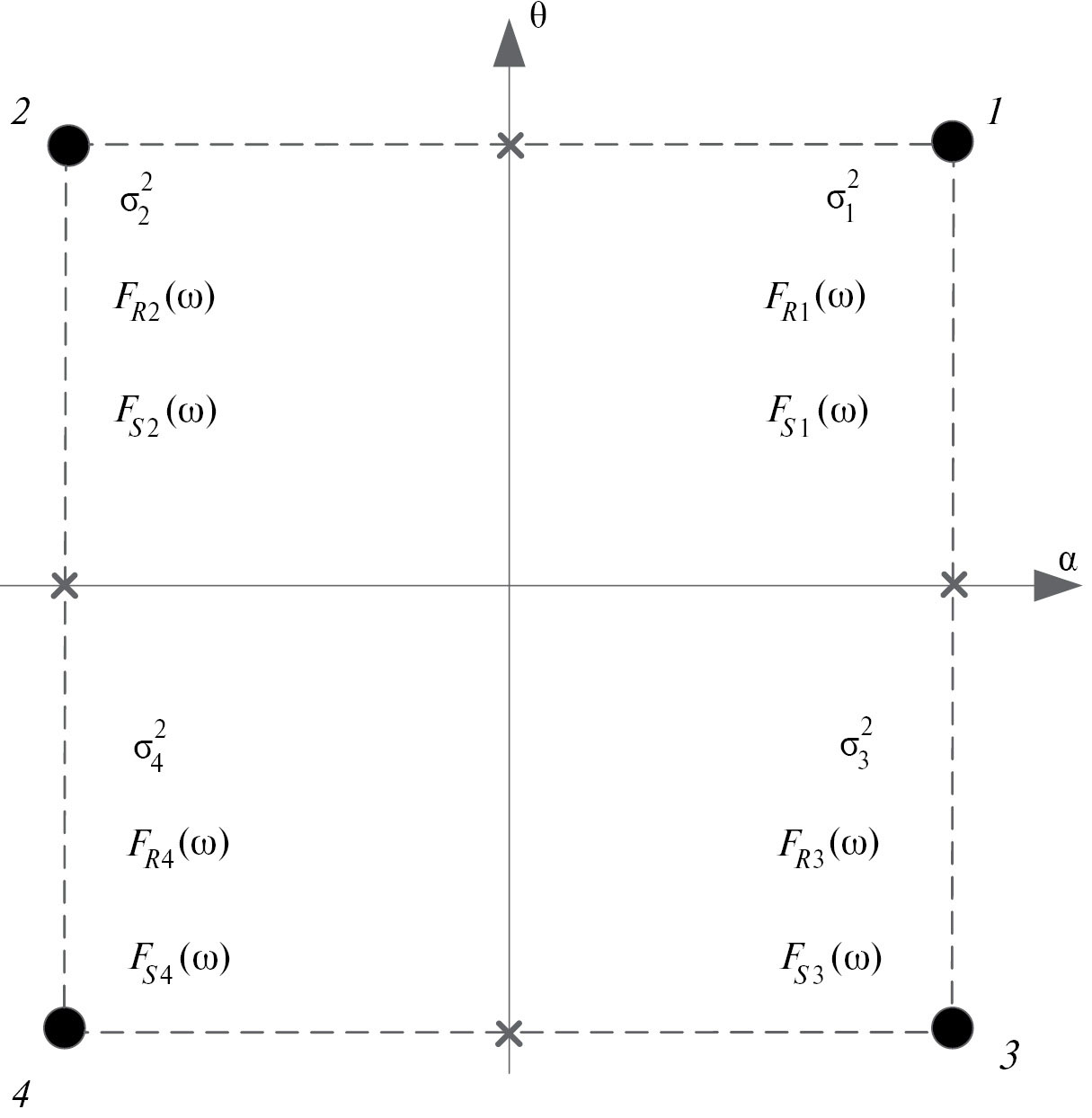 Руководствуясь результатами [7], синтезируем четырехточечную модель. Ее излучатели 1…4 располагаются в вершинах квадрата (рис. 4).