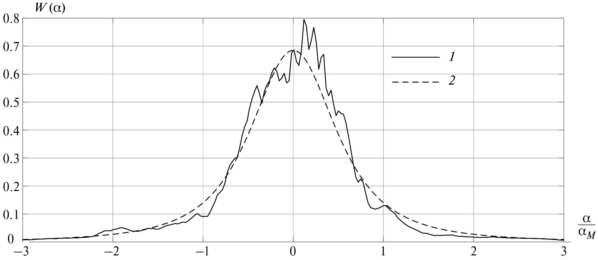 Рис. 6. Экспериментальная (1) и рассчитанная теоретически (2) ПРВ углового шума, полученная с использованием макета матричного имитатора; имитируемая дальность 1000 м.