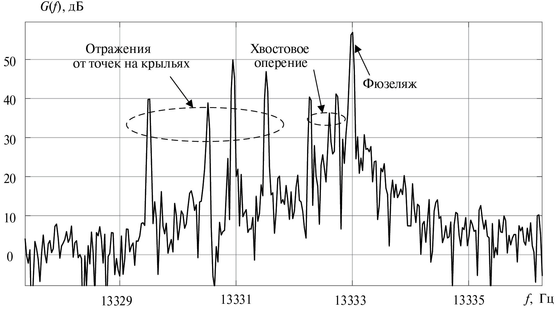 В доплеровском спектре (см. рис. 8) принятого сигнала отчетливо видны компоненты, сформированные отражениями от фюзеляжа самолета, элементов, расположенных на крыльях, и хвостового оперения. Форма доплеровского спектра соответствует ожидаемой для носового ракурса наблюдения самолета. Максимальную доплеровскую частоту формируют точки фюзеляжа. Точки на крыльях и хвостовом оперении дают меньшие частотные сдвиги. Эти точки симметричны относительно фюзеляжа, поэтому доплеровские спектры эхосигналов от точек, расположенных слева и справа от фюзеляжа, идентичны.