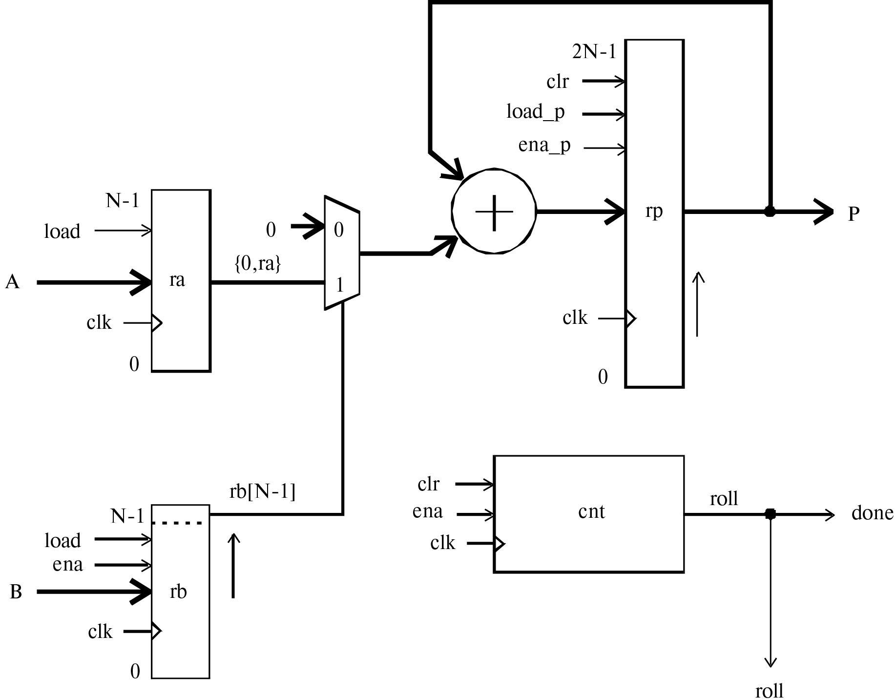 Значения чисел A и B поступают на вход операционного устройства. На выходах операционного устройства формируется произведение P и сигнал done, указывающий на окончание процесса умножения. Значение множимого A (см. рис. 2) загружается в регистр ra, значение множителя B загружается в сдвиговый регистр rb; произведение P формируется в сдвиговом регистре rp. Сумматор выполняет сложение содержимого регистра rp с множимым A или с нулем. Мультиплексор служит для выбора второго операнда сумматора. Счетчик cnt формирует внутренний сигнал обратной связи roll, совпадающий с сигналом done, единичное значение которого указывает на окончание процесса умножения.