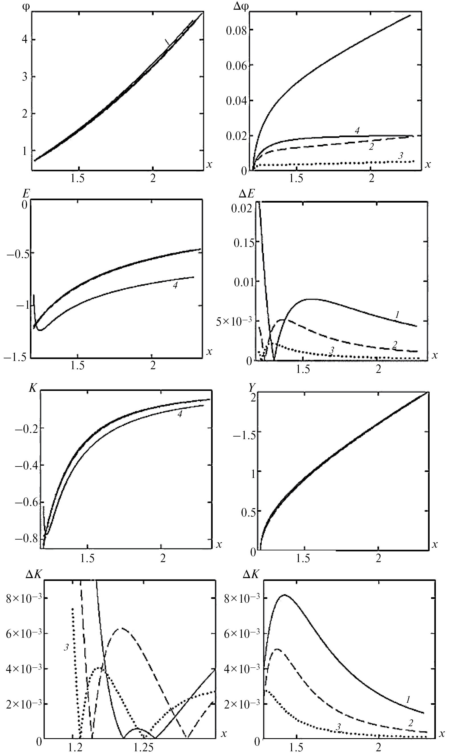 Из табл. 9, 10 видно, что ошибка вычисления φ, E, k при использовании ортогональных координат составляет 4, 35 и 20 %, а в неортогональном варианте – 1, 7 и 3 %. Обратим внимание на тот факт, что начальная ширина пучка 0.2 равна радиусу кривизны оси в точке старта, поэтому он не может считаться узким.
