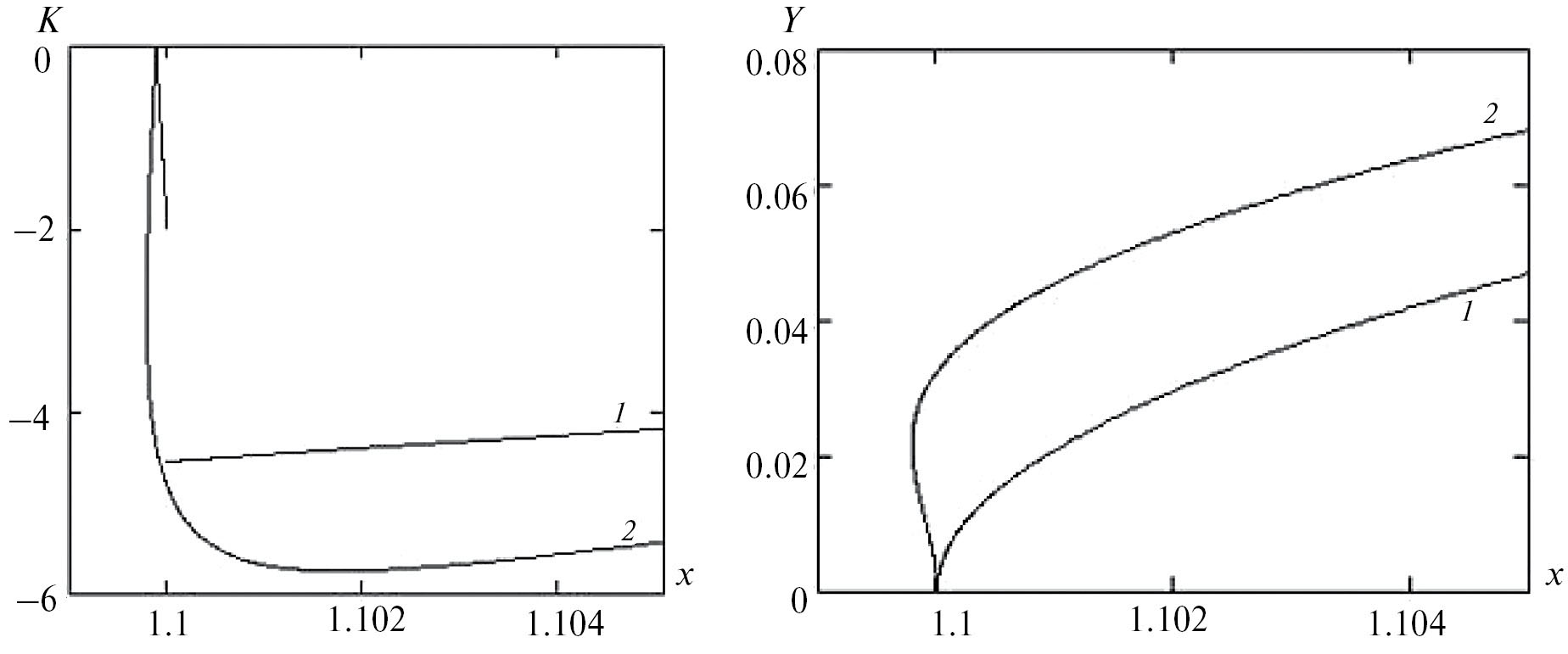 Производные от х, y по поперечной координате для (отношение полуосей ) приведены на рис. 15. При увеличении область резких градиентов все более концентрируется вблизи вершины эллипса с большей кривизной, причем значения производных сильно возрастают. Для () порядок функций , , и , , составляет 2, 10, 60 и 1, 6, 70; для () – 3, 70, 1600 и 2, 20, 2500. На рис. 16 приведены характеристики параметров потока при , , , где , а также величины с индексами exa соответствуют вершине с большей кривизной. Числовую информацию для этого случая и для , , ; , , содержат табл. 12–14.
