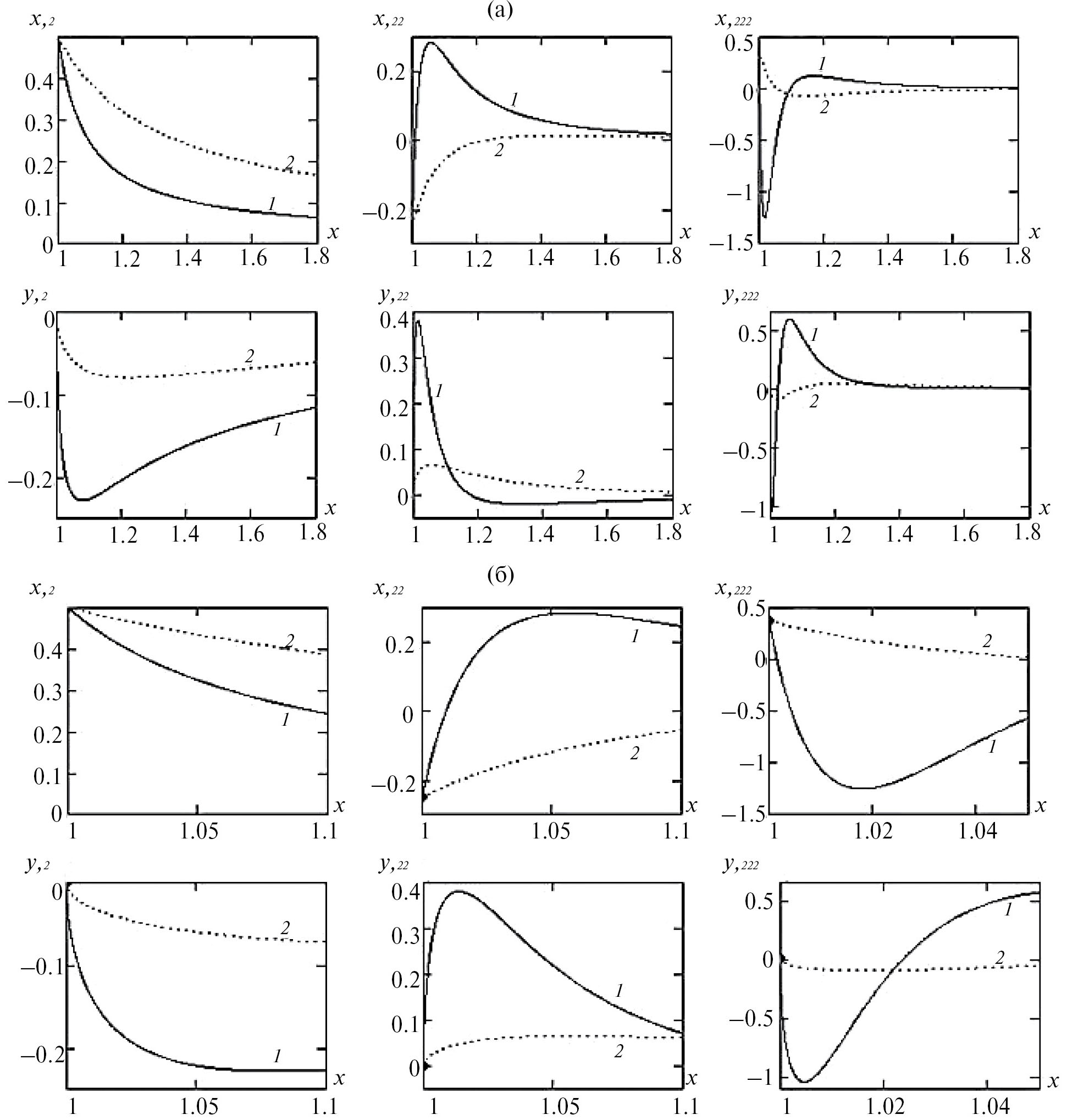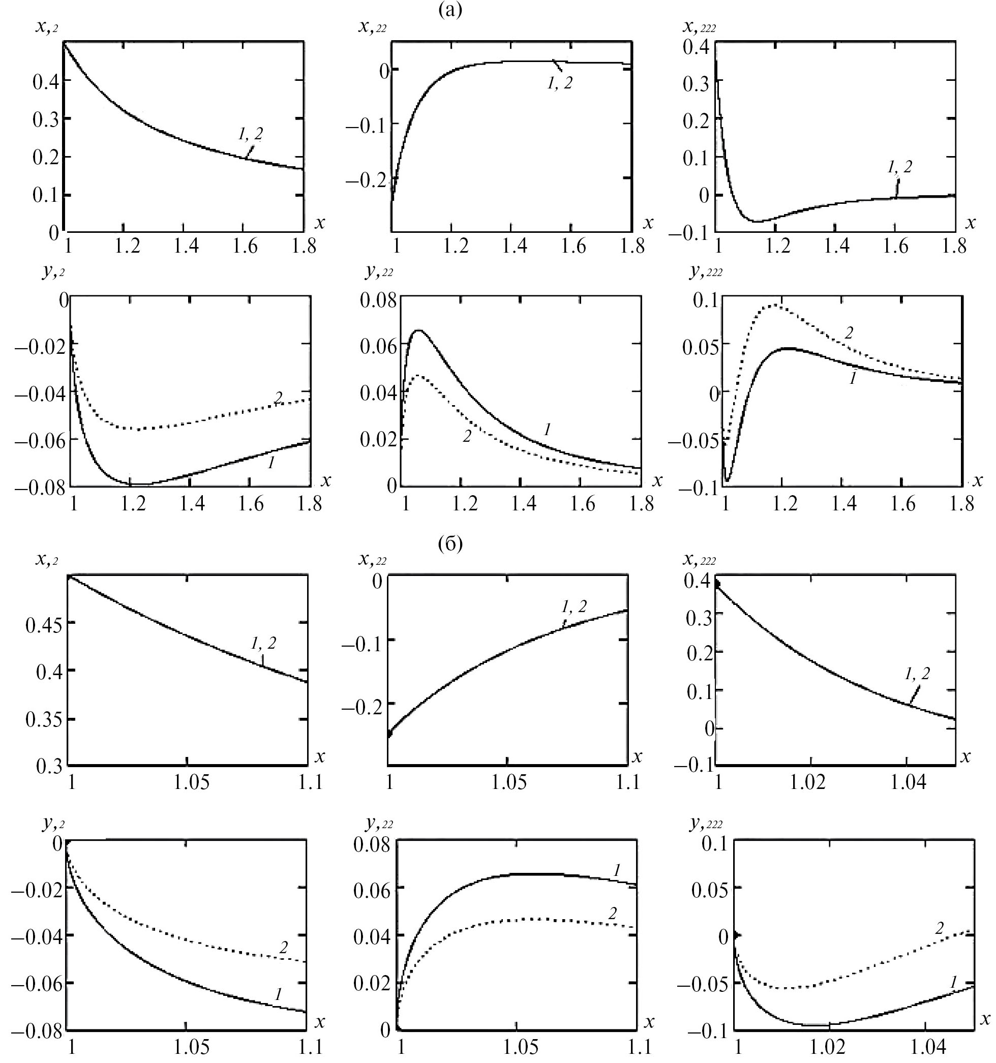 Рис. 10. Производные от х, у по x1, x2 для потока с осью – гиперболой Ω = 5 (а), в окрестности плоскости инжекции (б); 1 – l-представление, 2 – W-представление.