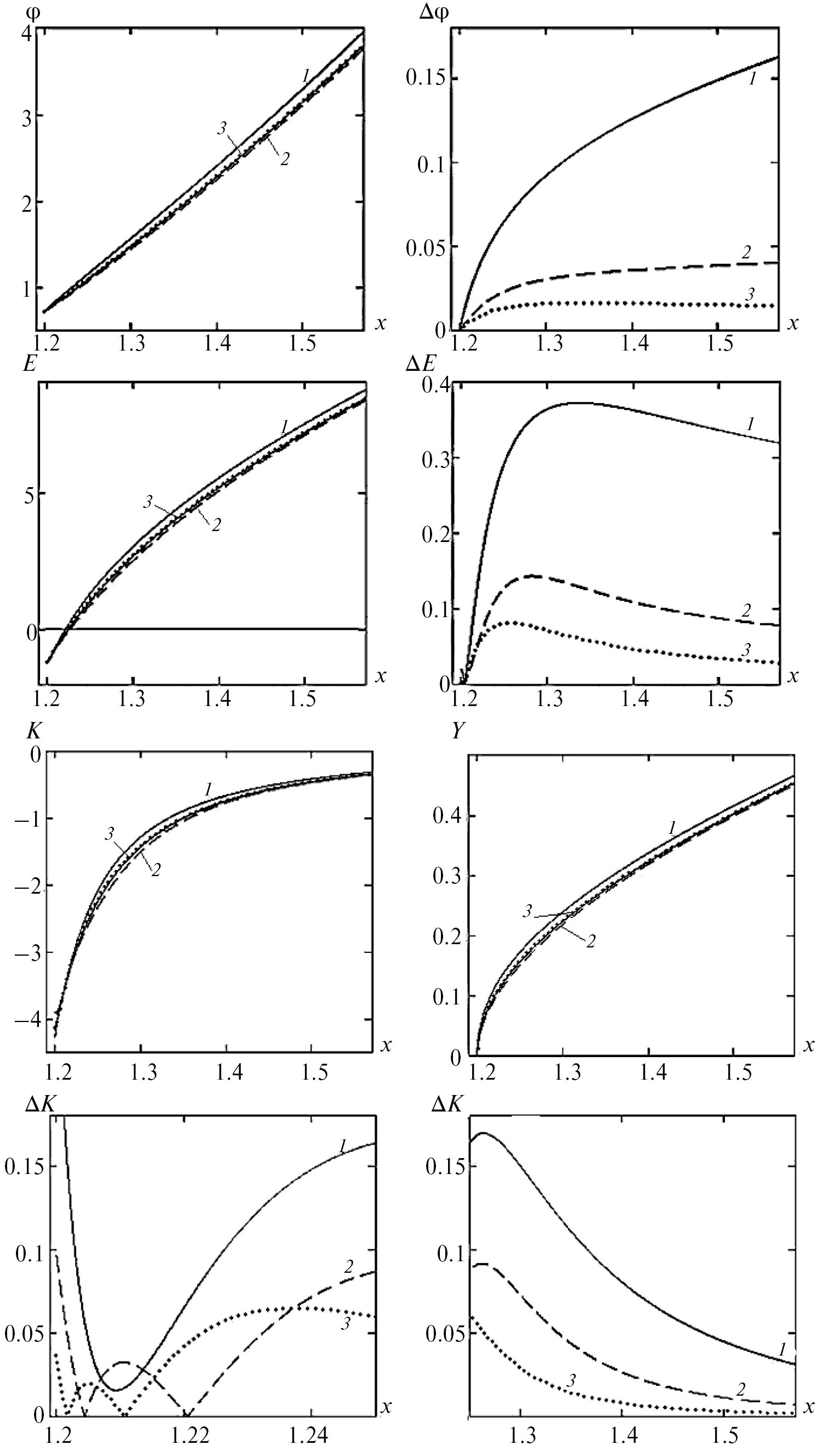 Полярные координаты связаны с геометрией течения, поэтому вопрос о точности геометризованной модели сводится к построению ряда Тэйлора по поперечной координате для наиболее быстро меняющейся функции – . В работе [20] отмечено влияние вида этой переменной на точность приближенного решения. Примем за ось пучка линию R = 1. Результаты двух вариантов определения поперечной координаты: