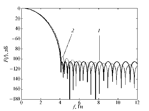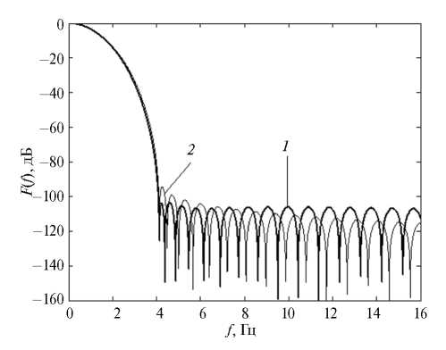 Рис. 3. Спектры оконной функции субоптимального окна φ-класса при α = 4.05 (1) и оконной функции Кайзера при αk = 4 (2), для обеих кривых β = 1.