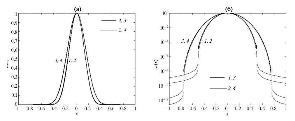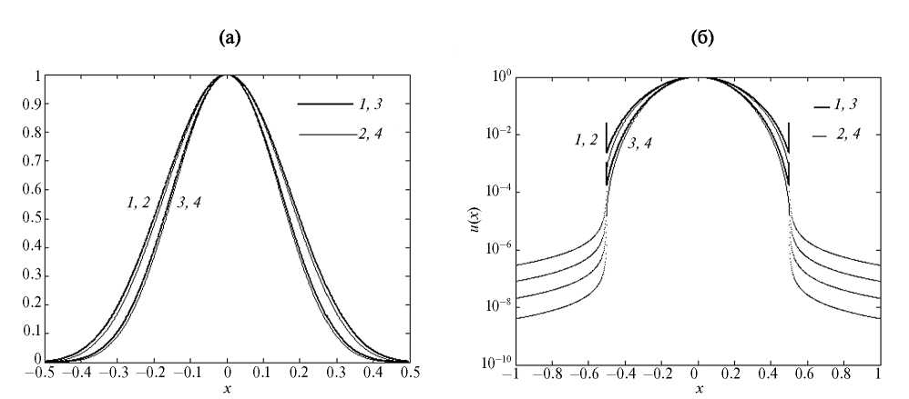 Рис. 8. Оконные функции субоптимального окна Ψ-класса при α = 3.1225 (1) и 4.0927 (3), оконные функции Кайзера при αk = 3 (2) и 4 (4), для всех кривых β = 1, шкала по оси ординат — линейная (а) и логарифмическая (б).