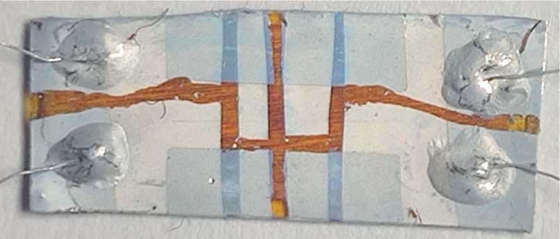 Второй метод создания одноосной деформации заключался в изгибе упругой подложки (далее — метод изгиба подложки), на поверхности которой был расположен изучаемый образец. Данный метод описан в литературе [6, 7] и позволяет получать как деформацию растяжения, так и деформацию сжатия. В нашем случае создавалась и исследовалась многослойная структура, показанная на рис. 1в. Последовательность создания структуры была следующая: сначала на медную фольгу толщиной 100 мкм наклеивали каптоновый скотч толщиной 40 мкм, на который с помощью серебряной пасты наклеивали четыре медные проволочки. Затем под микроскопом на скотч укладывали образец, на который через маску напыляли индиевые контакты, после чего структуру заливали эпоксидной смолой. Пример исследовавшейся структуры представлен на рис. 2. Следует обратить внимание, что деформация образца в этой структуре определяется толщиной и радиусом изгиба подложки из эпоксидной смолы. Достоинством такой структуры является сравнительно хороший тепловой контакт образца с медной фольгой.