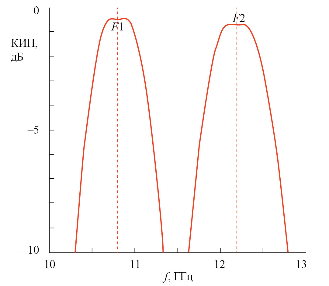 На рис. 8 показана частотная зависимость КИП в однодиапазонном режиме, полученная для fr1 = 11.18, fr2 = 11.78, P1 = 16.91, P2 = 16.35, Q1 = Q2 = 34, R1 = 0.18, R2 = 0.18, ε = 2.1, N1 = N2 = 17, Δz = 9, θ0 = –7.02°. Видно, что в полосе пропускания антенна имеет частотную характеристику, аналогичную характеристике фильтра четвертого порядка.