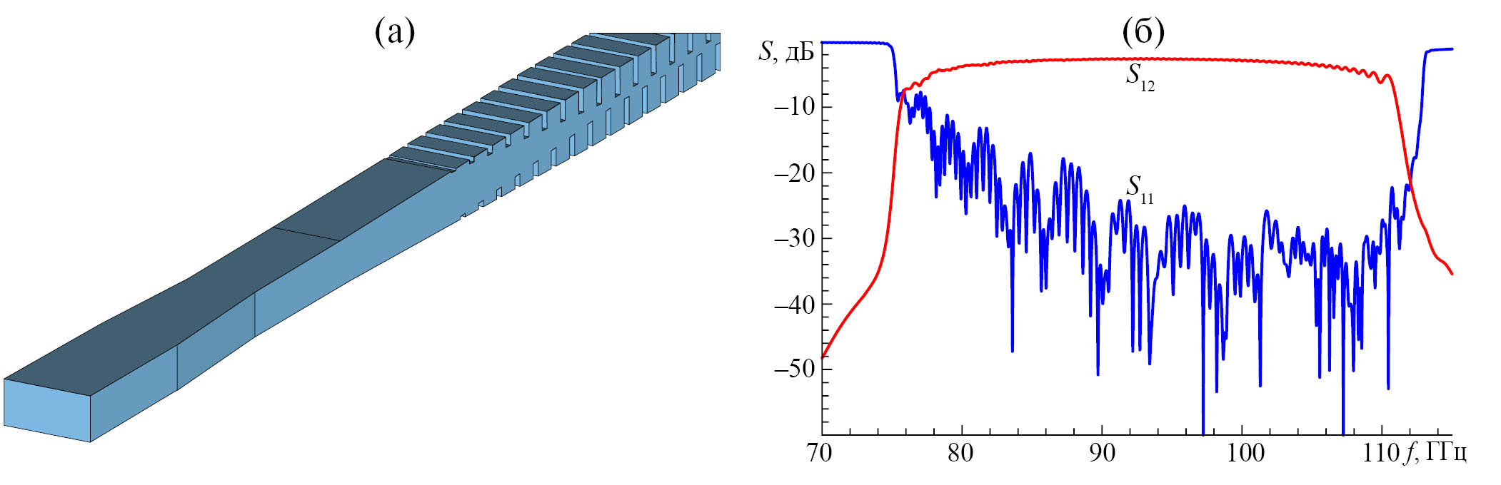 Далее была разработана конструкция устройства ввода/вывода, которая представляет собой согласующий переход на стандартный прямоугольный волновод WR-10 сечением 2.54 × 1.27 мм2. Он состоит из двух областей (рис. 3а): в первой одновременно уменьшается высота ламелей и высота волновода, во второй увеличивается ширина волновода по горизонтали. S-Параметры полноразмерной структуры, состоящей из 50 периодов ЗС с согласующими участками, были исследованы путем моделирования в пакете CST Studio Suite. Геометрия устройства ввода/вывода оптимизировалась с помощью встроенных средств пакета CST. При моделировании эффективная проводимость металлических стенок ЗС была выбрана равной 2.0×107 См/м, что учитывает шероховатость поверхности. Результаты моделирования приведены на рис. 3б. В диапазоне 90…100 ГГц коэффициент отражения не превышает –30 дБ, а ослабление составляет примерно 2.6 дБ или 0.043 дБ/период.