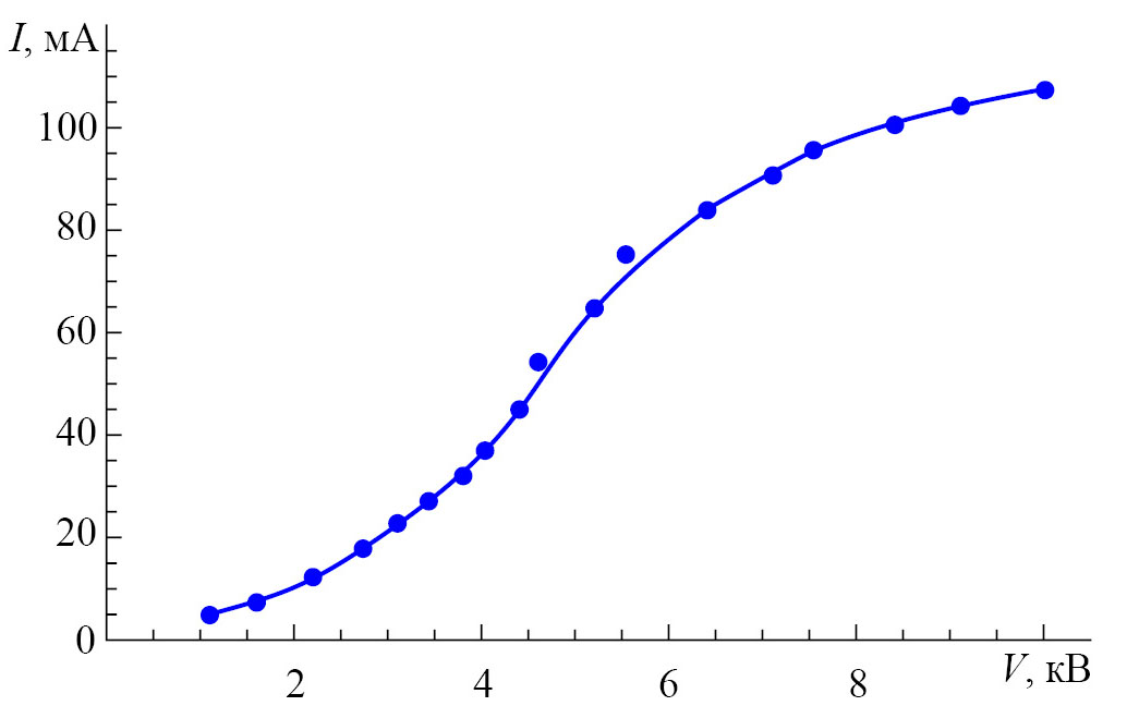 Для измерения вольт-амперных характеристик (ВАХ) был собран диодный макет электронной пушки, который был размещен в вакуумной камере. При достижении вакуума 5×10–7 Торр пушку подвергали пирометрированию и тренировке. Рабочая температура катода составляла 1200 °С. Для снижения температурной нагрузки на узлы макета измерения ВАХ были проведены в импульсном режиме при длительности импульса 10 мкс и скважности 2000. Расстояние от катода до анода составило 4.2 мм. Ввиду ограниченных возможностей высоковольтного модулятора ускоряющее напряжение в эксперименте составляло до 10 кВ, т.е. меньше, чем в расчетной модели. Результаты измерений ВАХ представлены на рис. 6. Максимальный ток, зарегистрированный в эксперименте, достигал 110 мА.