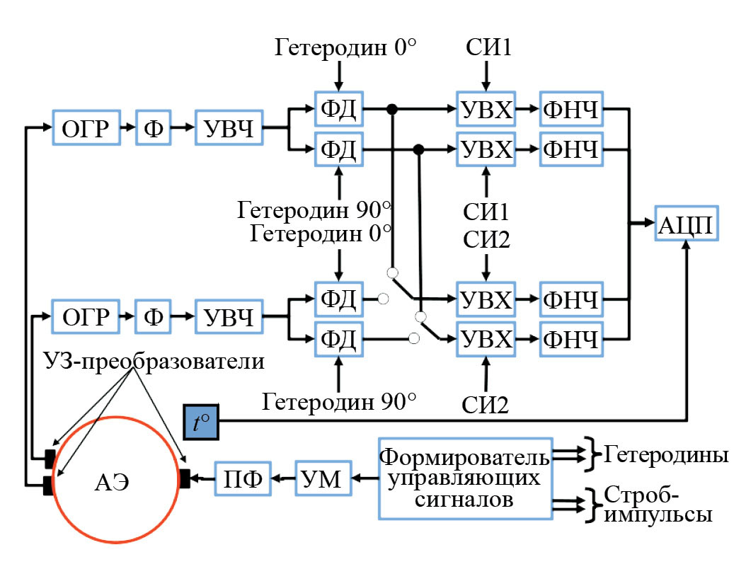 В схеме реализованы два канала приема, что позволяет реализовать два возможных режима мониторинга. В первом случае используются два приемных датчика по одному на канал обработки сигнала. При этом возможен прием по двум направлениям распространения УЗ-импульсов, например, вдоль диаметра и хорды АЭ. Во втором режиме при использовании сигнала с одного приемного датчика в двух каналах обработки с различными задержками строб-импульсов можно регистрировать изменение фазы различных мод УЗ-волны (например, прямой продольной и отраженной поперечной), разделенных по времени прихода на приемный датчик.