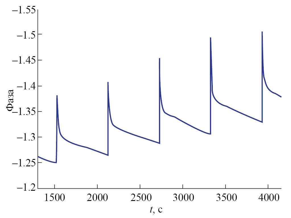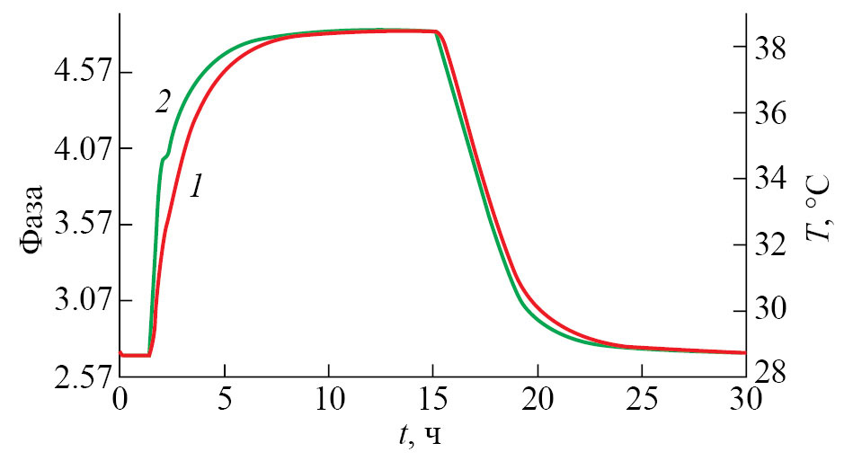 На рис. 6 показана осциллограмма изменения фазы и поверхностной температуры в процессе нагрева и охлаждении АЭ. Отметим, что имеет место запаздывание кривой фазы по отношению к кривой поверхностной температуры, что и естественно. При изменении внешней температуры на 10.5 °C фаза изменяется на 2.22 рад.